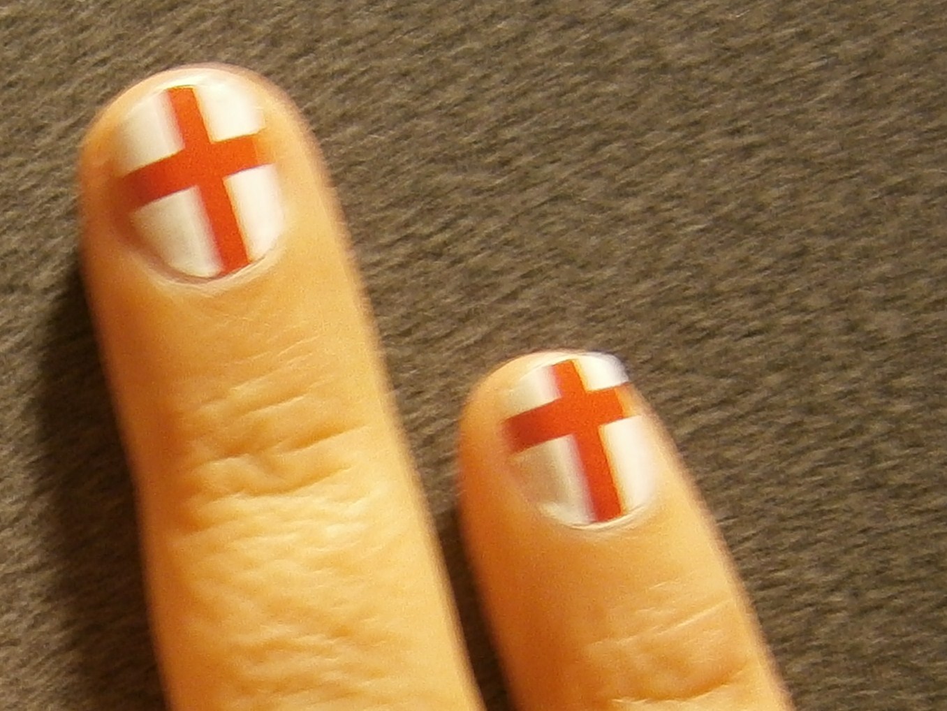 Sticking on the 10 union flag nail transfers was easy for a boy practised in the delicate operation of positioning transfers onto airfix models. The golden rule is not to let the thing stick to itself. I did however learn the self-evident truth that doing anything to your right hand can only be done with your left hand. A rather obvious point for more experienced nail-varnishers. Now I understand why people need manicurists.