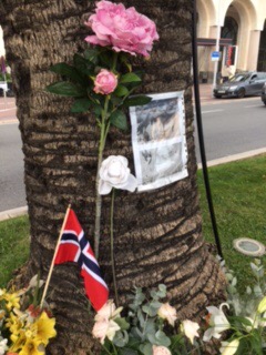 As we crossed the road yesterday, we noticed some fresh flowers by a tree and a Norwegian flag. Attached to the tree were two photographs of Saskia, a 29 year old German woman who was one of the victims. Handwritten, in the ink and tears of bottomless grief, the simple word “fur meine tochter”. She was called Saskia.