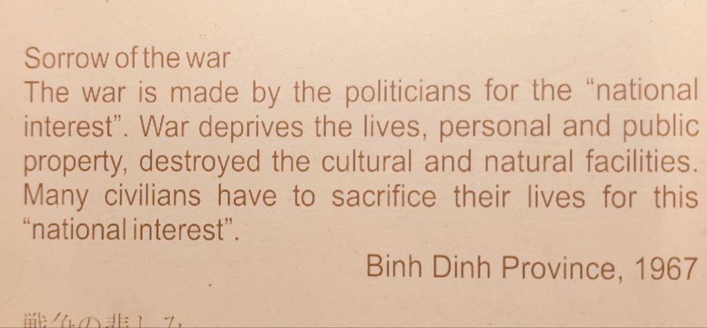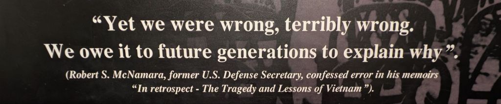 Today we visited the War Remnants Museum in Saigon. Here we saw the same tragic story from the Vietnamese side. We literally saw it – with our eyes – in a room full of graphic photographs and video film. Awful pictures of GIs injured and dying in dirt and mud. Fortunately for us, mainly in black and white to spare us the more shocking impact.
