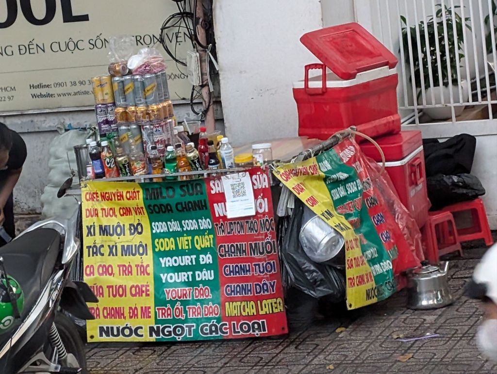 But most of all they are there for the scooters and motorbikes. Yes they ride in swarms on the road, but they park up on the pavements, maybe for the day, or maybe for a few minutes to buy something. They form a queue on the pavement for food.